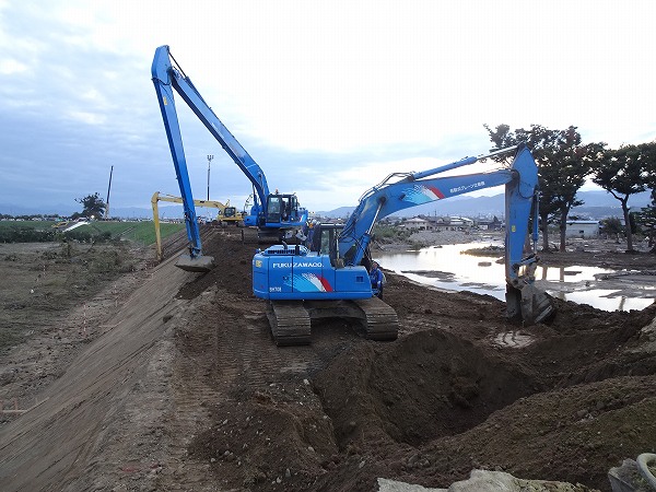 先日の台風19号により千曲川 長野市穂保地先において、10月13日5時30分頃堤防の決壊を確認しました。弊社では国土交通省北陸地方整備局より要請があり、災害協定に基づきまして災害支援をおこないました。